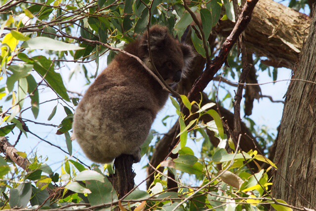 You’ll know that koalas eat eucalyptus. And only eucalyptus. What you may not know is that there are literally dozens of eucalypts, and that koalas in Victoria are very fussy. Here they only eat one variety – Manna Eucalyptus. Here starts the problem. Having grown in number to an almost unsustainable population of 23 per hectare in this area, they had begun to overgraze the Manna. Despite a recent sterilisation programme, the trees are insufficient to support those left, and the koalas are not versatile enough to shift their diet even to closely related varieties. There are now many overeaten dead trees, and a falling population of koalas, many of whom slowly starve to death. They are not yet formally endangered, or even protected, but they are in trouble here. (I hope I’ve got the chain of events right).